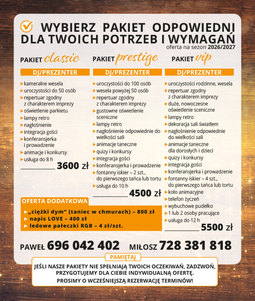 Duet DJ Pakko sprawi, że Twoje wesele, studniówka, bal lub impreza karnawałowa czy spotkanie rodzinne będzie niesamowitym przeżyciem z super zabawą do białego rana!